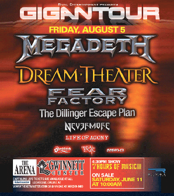 Gigantour feat. Megadeth & Dream Theater The Arena at Gwinnett Center Friday August 5, 2005 Gigantour Megadeth, Dream Theater, Fear Factory, The Dillinger Escape Plan, Nevermore August 5, 2005 The Arena at Gwinnett Center