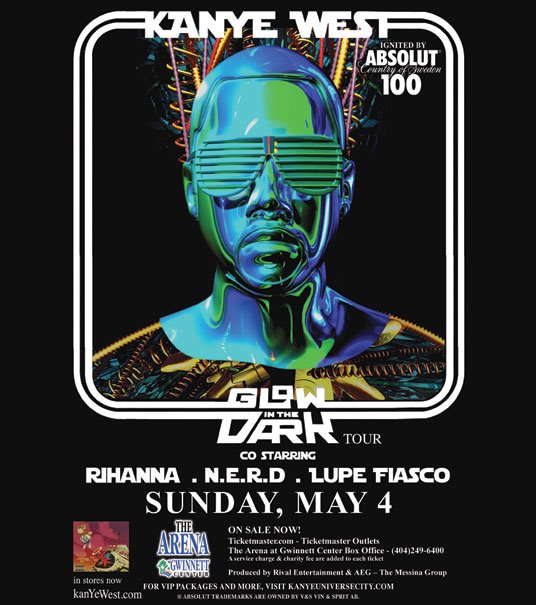 Kanye West & Rihanna The Arena at Gwinnett Center May 4, 2008 Kanye West Glow In The Dark Tour co-starring Rihanna, N.E.R.D, Lupe Fiasco May 4, 2008 The Arena at Gwinnett Center